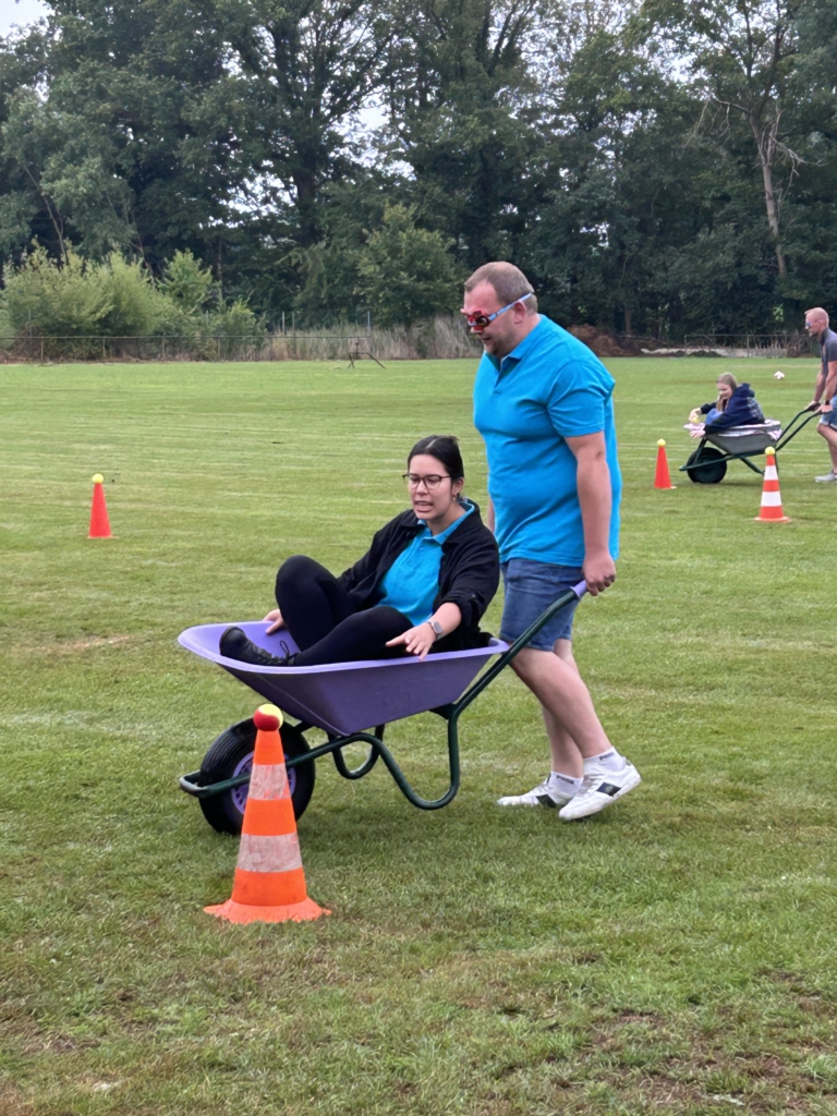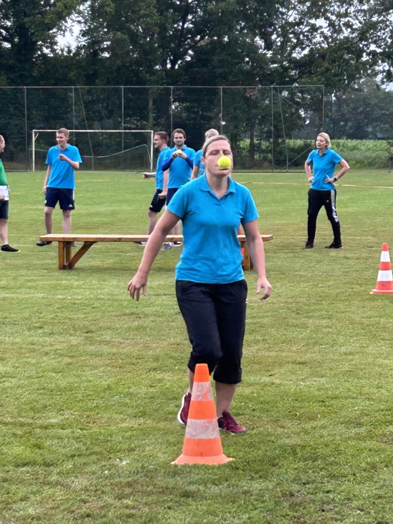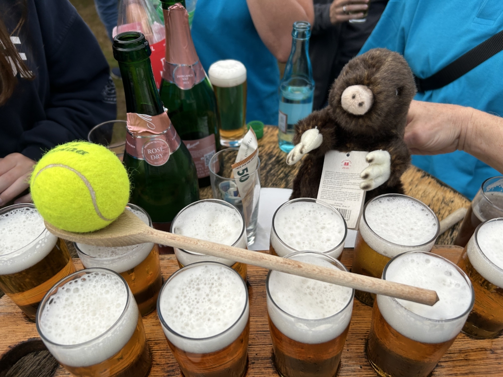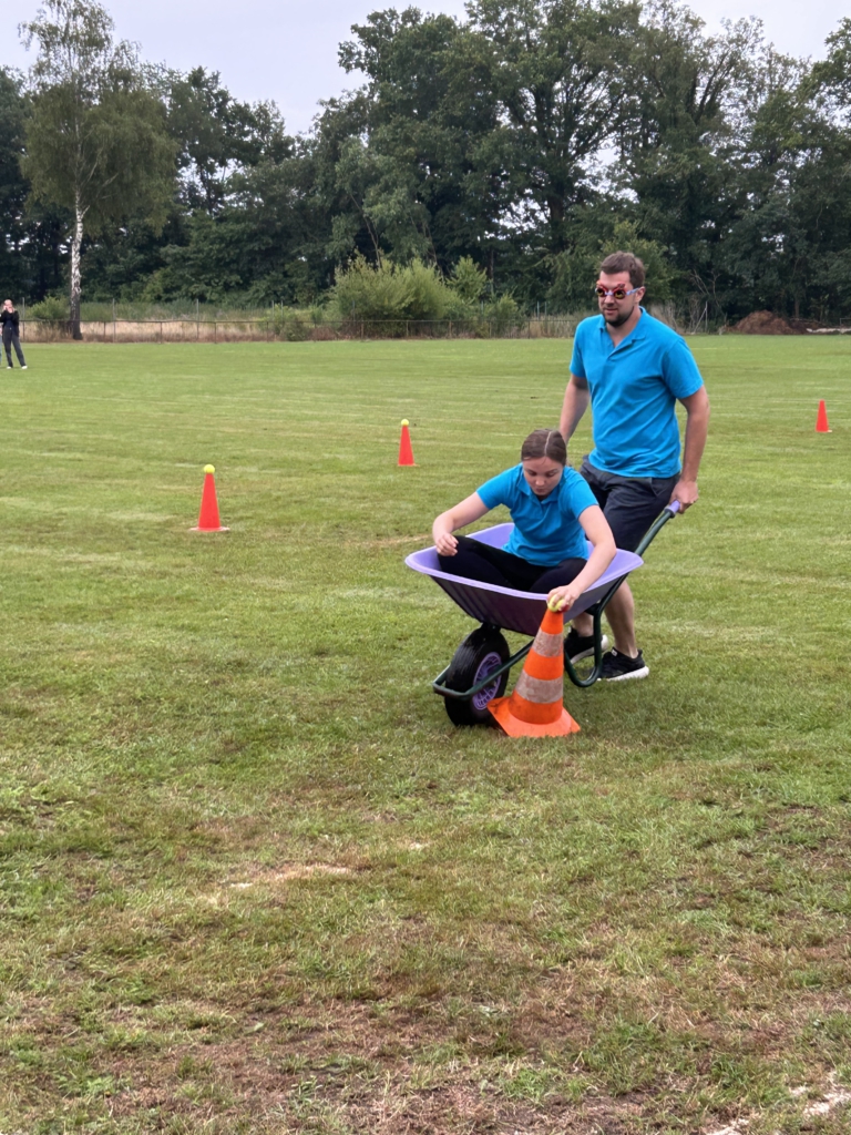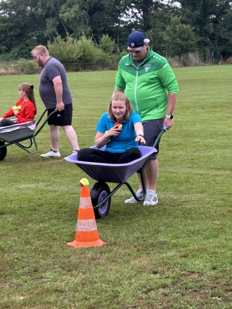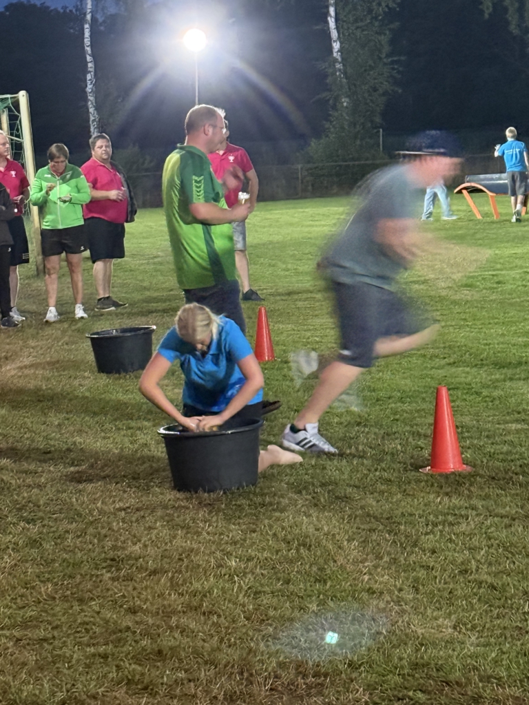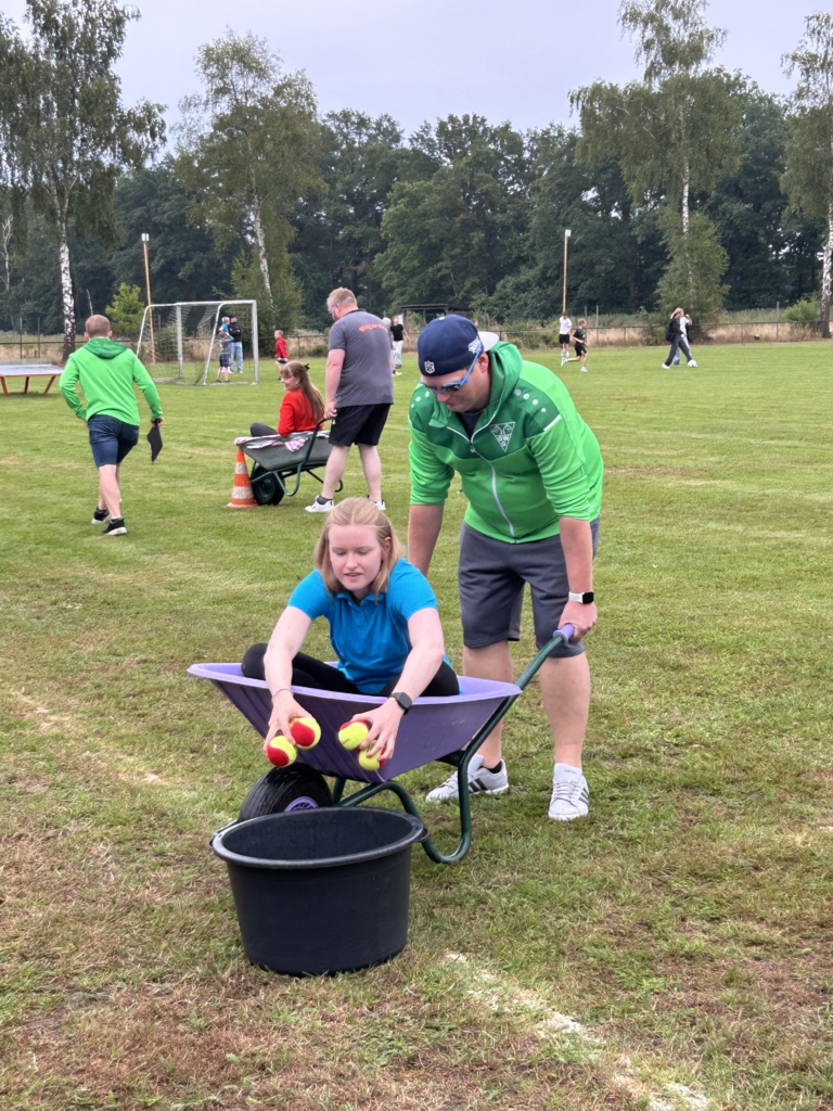 Um 19 Uhr wurde es ernst, als Friedhelm Siemann das Mikrofon an sich nahm und den zweiten Teil der Dorfmeisterschaften einläutete! Zunächst sollten im ersten Spiel mit einer blind gesteuerten Schubkarre, in der die Mitfahrerin die Richtung im Parkour ansagen musste, Tennisbälle von Hütchen eingesammelt werden. Im zweiten Spiel sollte ein Tennisball auf einem Kochlöffel im Mund durch einen Parkour transportiert werden und auch im dritten Spiel ging es um Bälle… Hier sollte ein Golfball mithilfe von zwei Löffeln durch ein Gitter von oben nach unten und zurück geführt werden.