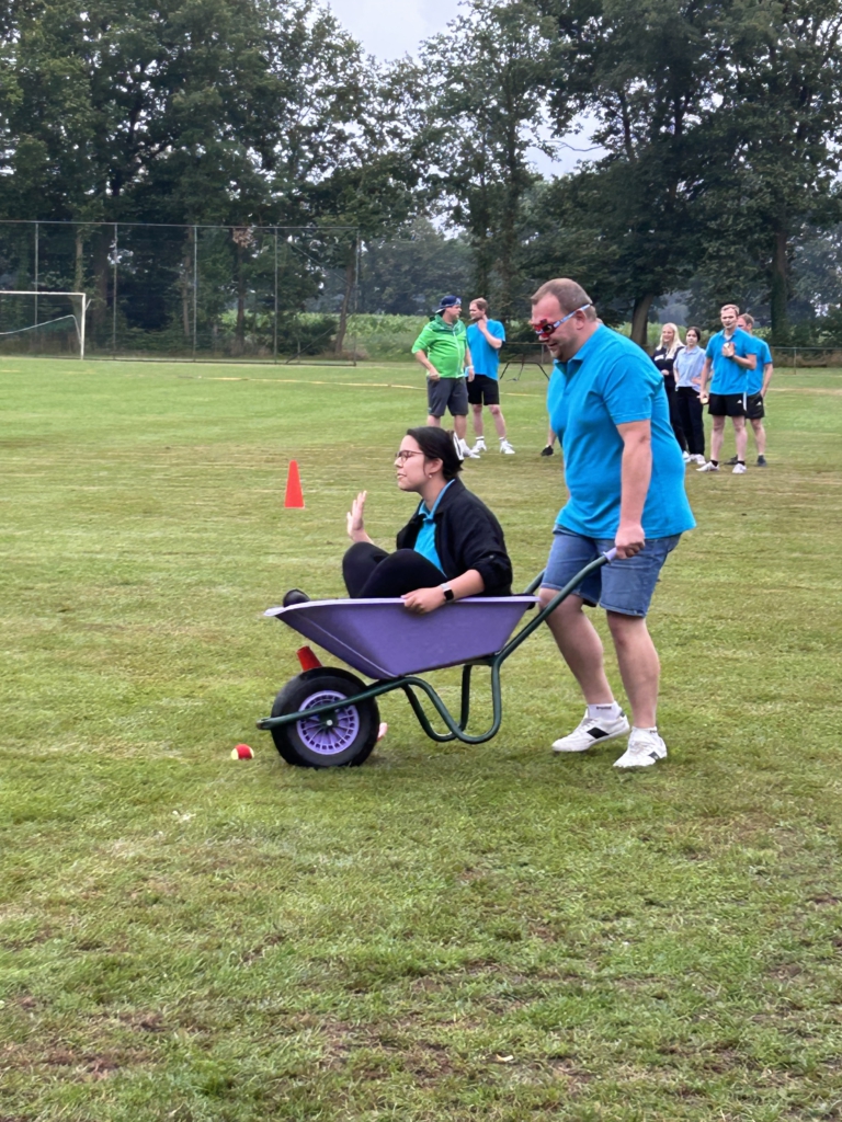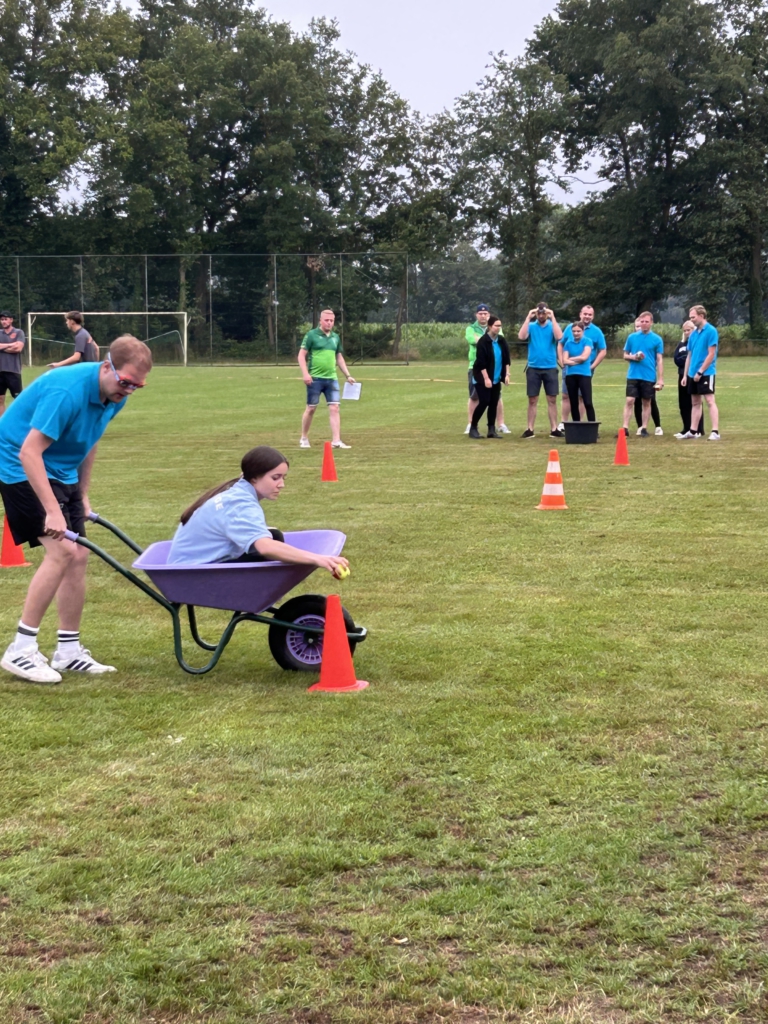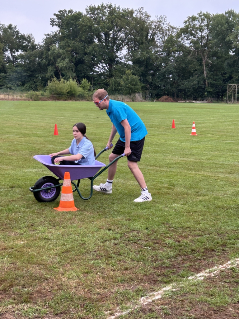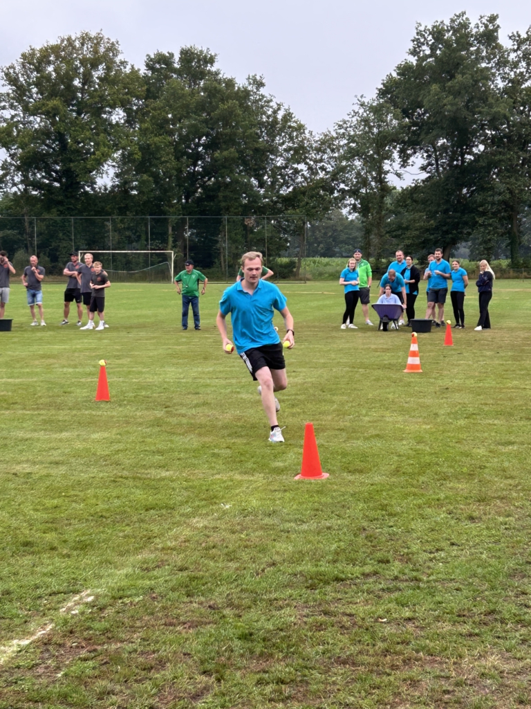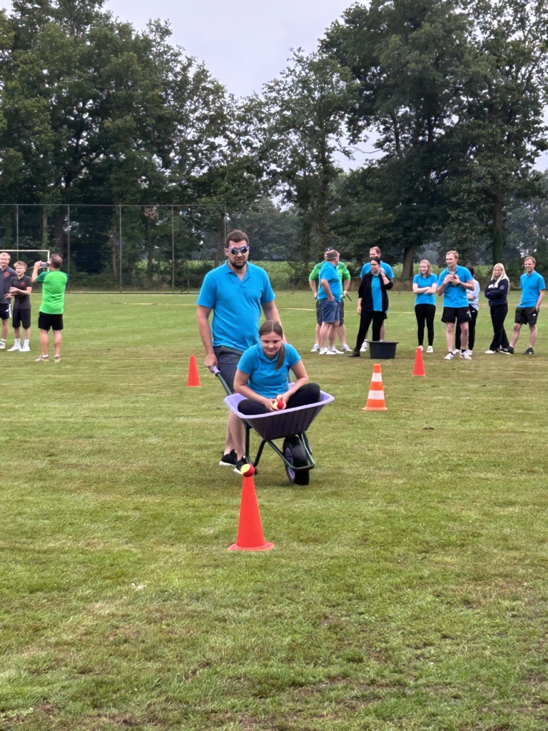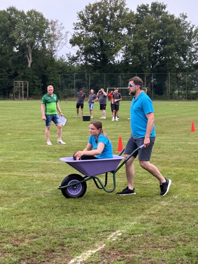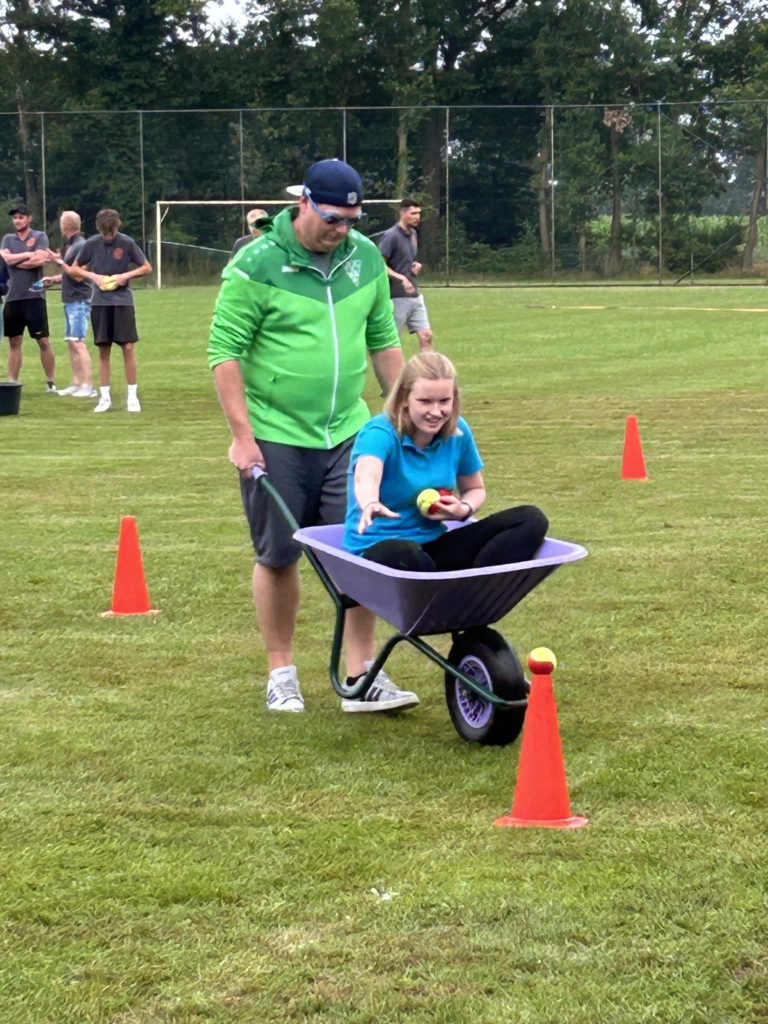 Um 19 Uhr wurde es ernst, als Friedhelm Siemann das Mikrofon an sich nahm und den zweiten Teil der Dorfmeisterschaften einläutete! Zunächst sollten im ersten Spiel mit einer blind gesteuerten Schubkarre, in der die Mitfahrerin die Richtung im Parkour ansagen musste, Tennisbälle von Hütchen eingesammelt werden. Im zweiten Spiel sollte ein Tennisball auf einem Kochlöffel im Mund durch einen Parkour transportiert werden und auch im dritten Spiel ging es um Bälle… Hier sollte ein Golfball mithilfe von zwei Löffeln durch ein Gitter von oben nach unten und zurück geführt werden.