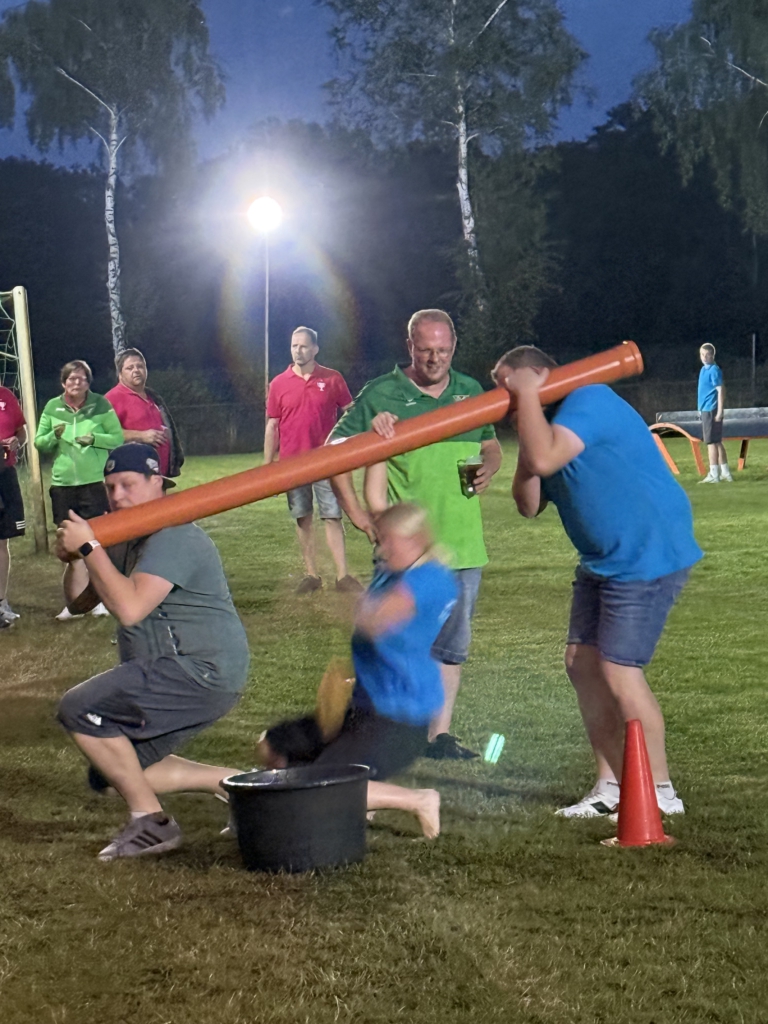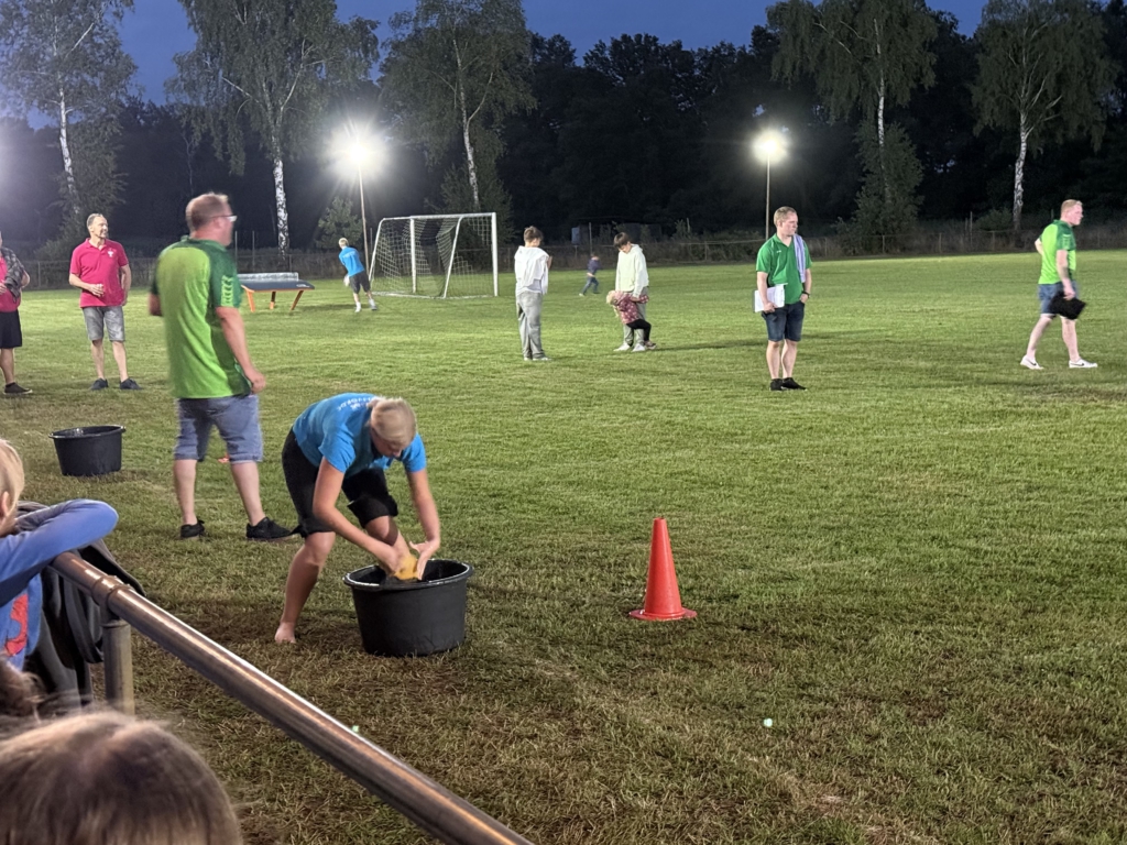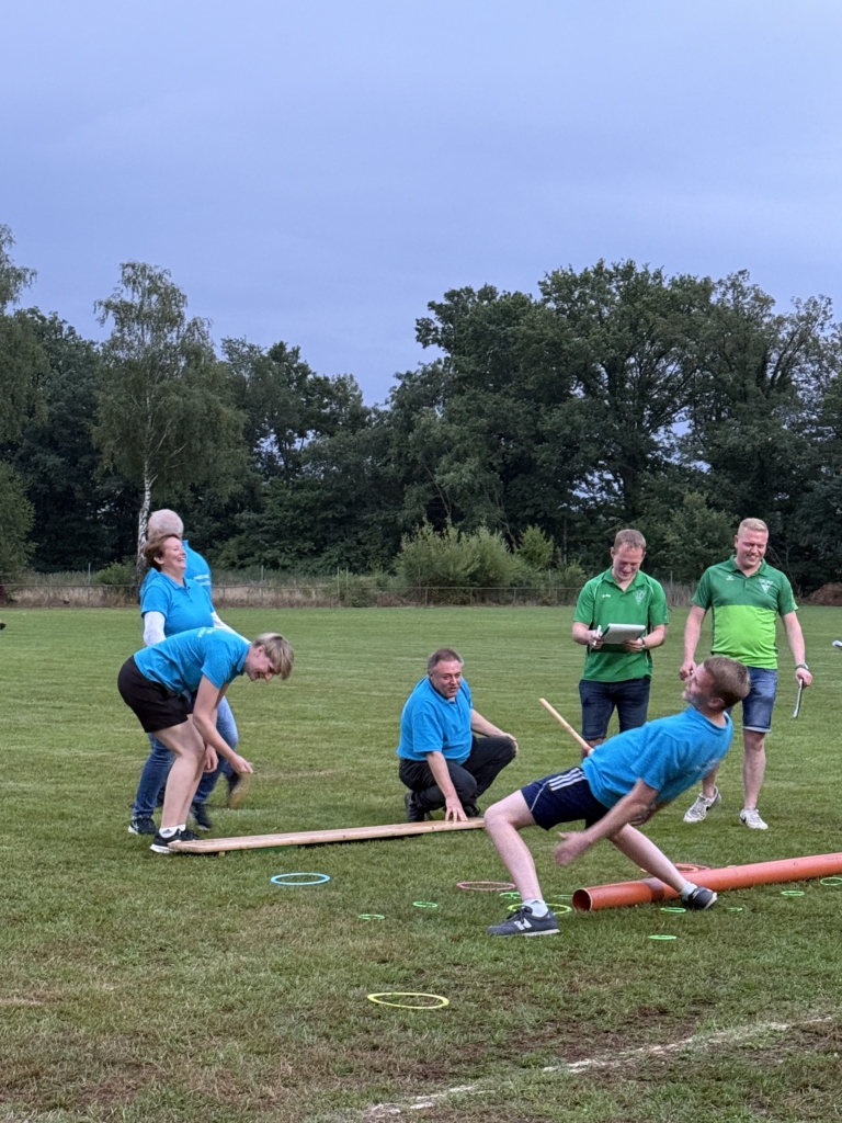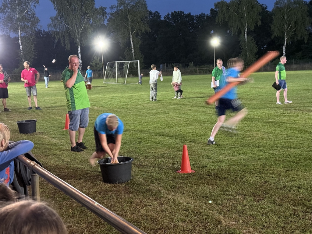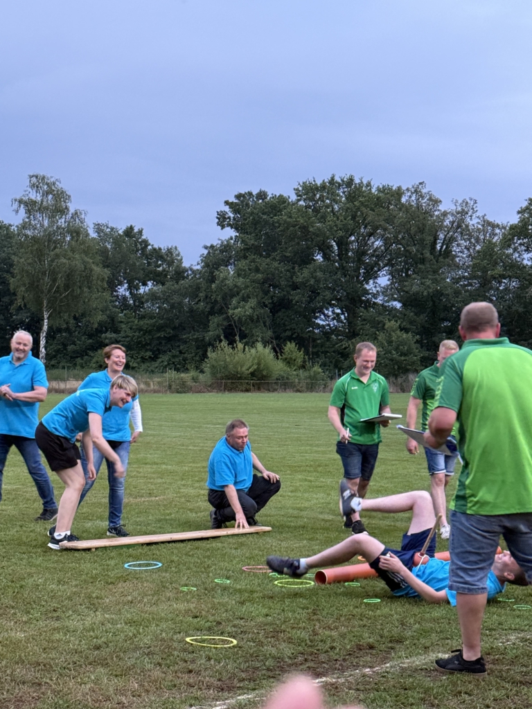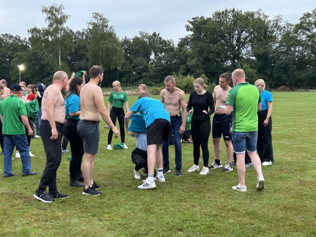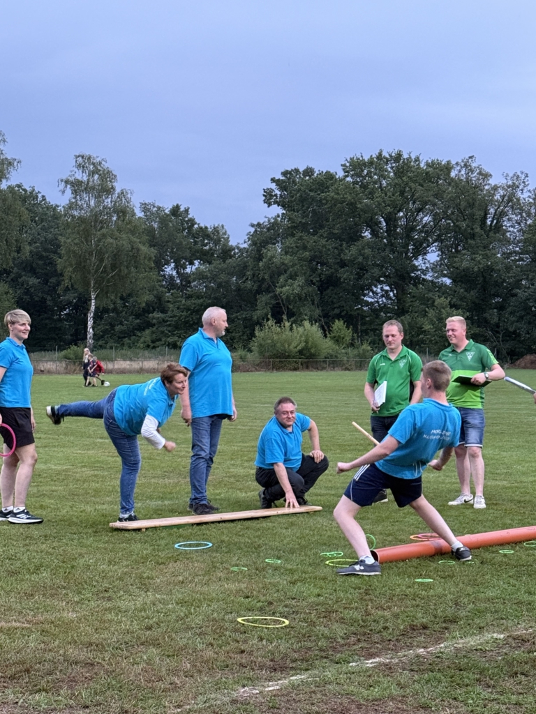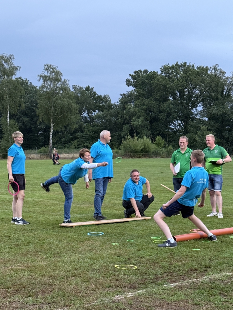 Beim ersten Teil der Dorfmeisterschaften 2025 hat sich das Orga-Team um die Familien Siemann, Sander und Reckweg wieder lustige, originelle und nervenaufreibende Spiele einfallen lassen. Es gab sechs Spiele zu bewältigen. Egal, ob es darum ging, die Bügelverschlüsse auf Bierflaschen zu schnipsen, sich mit einem Partner Rücken an Rücken mit Frischhaltefolie eingewickelt und einen Tennisball mit Schläger hochhaltend fortzubewegen, Tennisbälle mit einem Handtuch in ein kleines Fußballtor zu schleudern, als Menschenschlange von 10 Leuten durch einen Hula-Hoop-Reifen zu klettern, ein Fahrrad samt Cruiser rückwärts (!) durch einen Parkour zu manövrieren oder Wasser aus einer an den Schultern hängenden Gießkanne in einen Eimer zu befördern, es wurden immer mal wieder Nerven strapaziert und zugleich wurde auch herzlich gelacht.