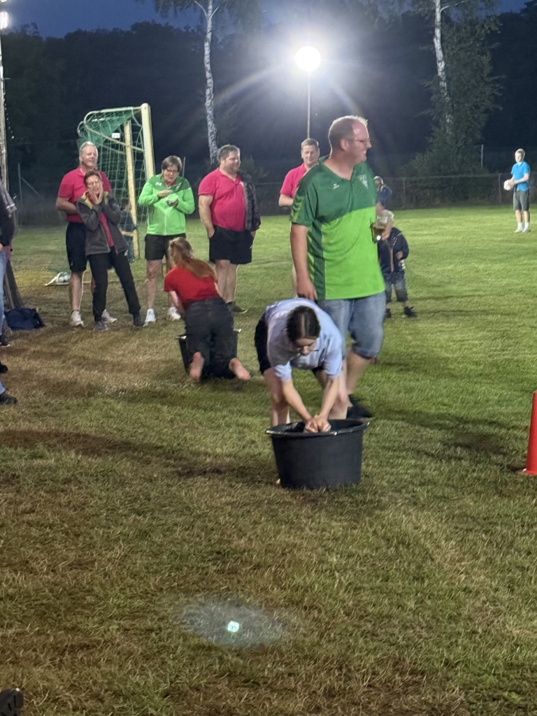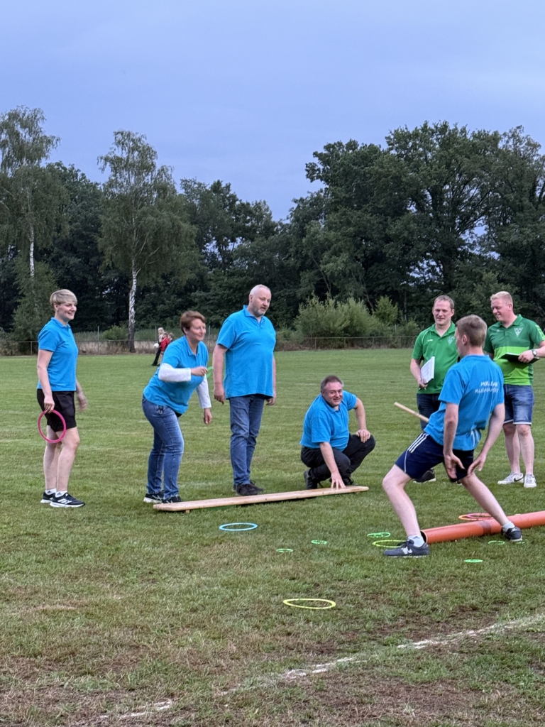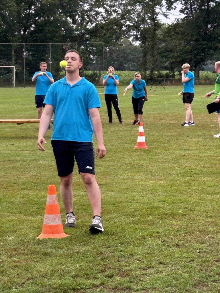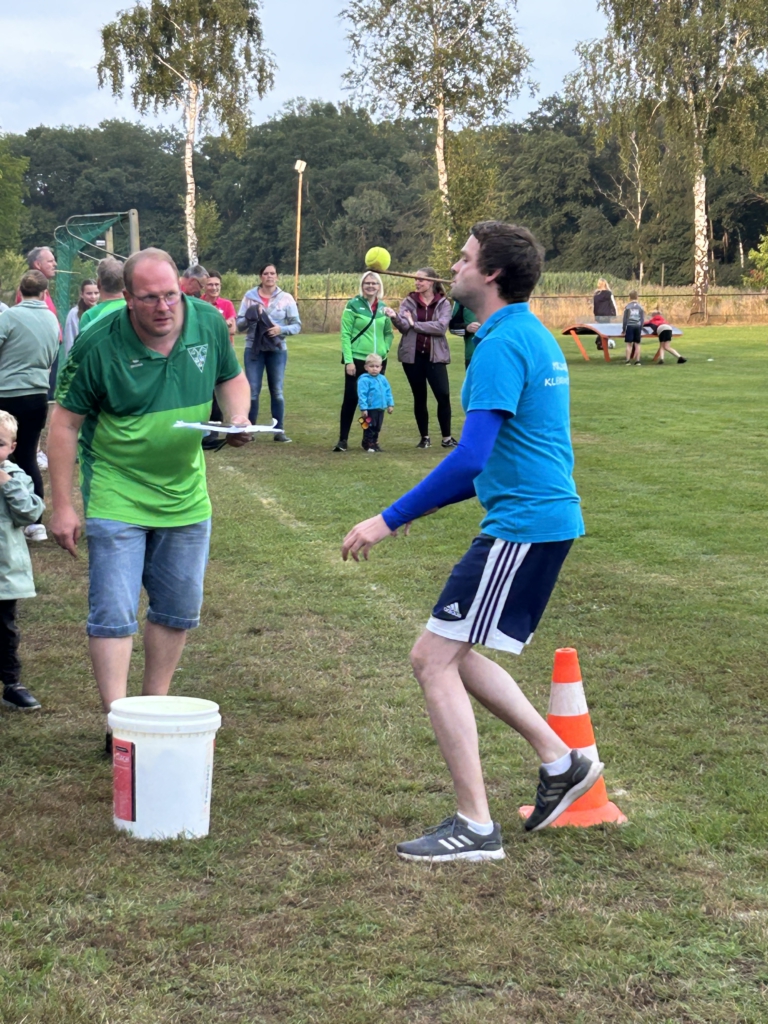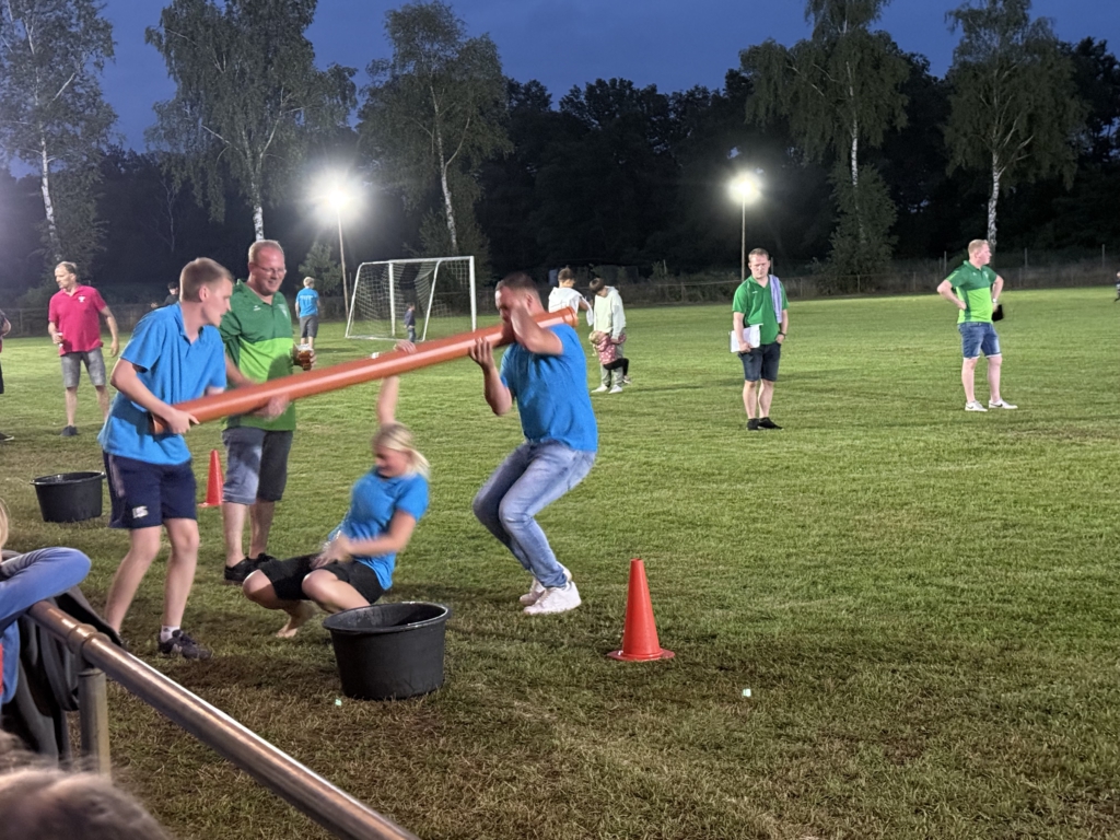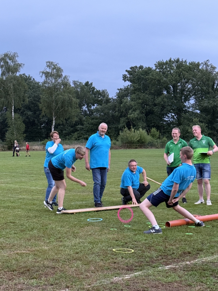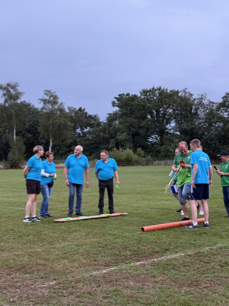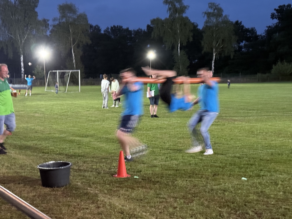 Beim ersten Teil der Dorfmeisterschaften 2025 hat sich das Orga-Team um die Familien Siemann, Sander und Reckweg wieder lustige, originelle und nervenaufreibende Spiele einfallen lassen. Es gab sechs Spiele zu bewältigen. Egal, ob es darum ging, die Bügelverschlüsse auf Bierflaschen zu schnipsen, sich mit einem Partner Rücken an Rücken mit Frischhaltefolie eingewickelt und einen Tennisball mit Schläger hochhaltend fortzubewegen, Tennisbälle mit einem Handtuch in ein kleines Fußballtor zu schleudern, als Menschenschlange von 10 Leuten durch einen Hula-Hoop-Reifen zu klettern, ein Fahrrad samt Cruiser rückwärts (!) durch einen Parkour zu manövrieren oder Wasser aus einer an den Schultern hängenden Gießkanne in einen Eimer zu befördern, es wurden immer mal wieder Nerven strapaziert und zugleich wurde auch herzlich gelacht.