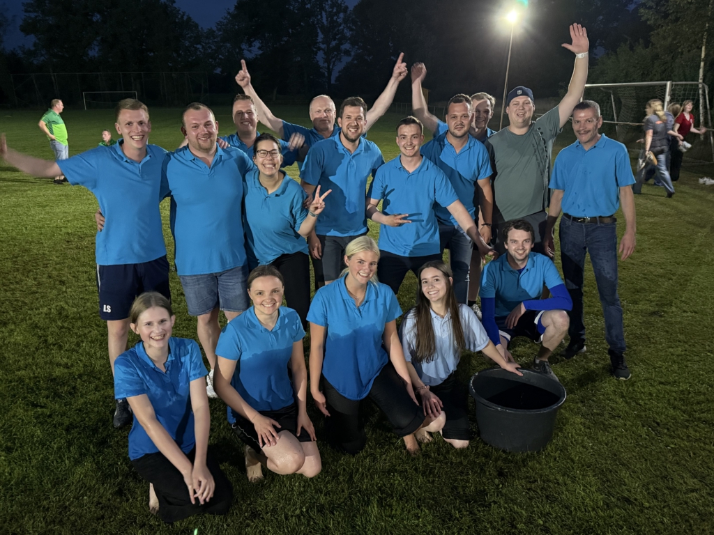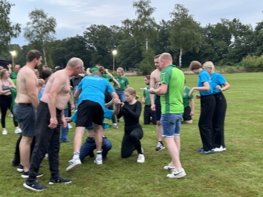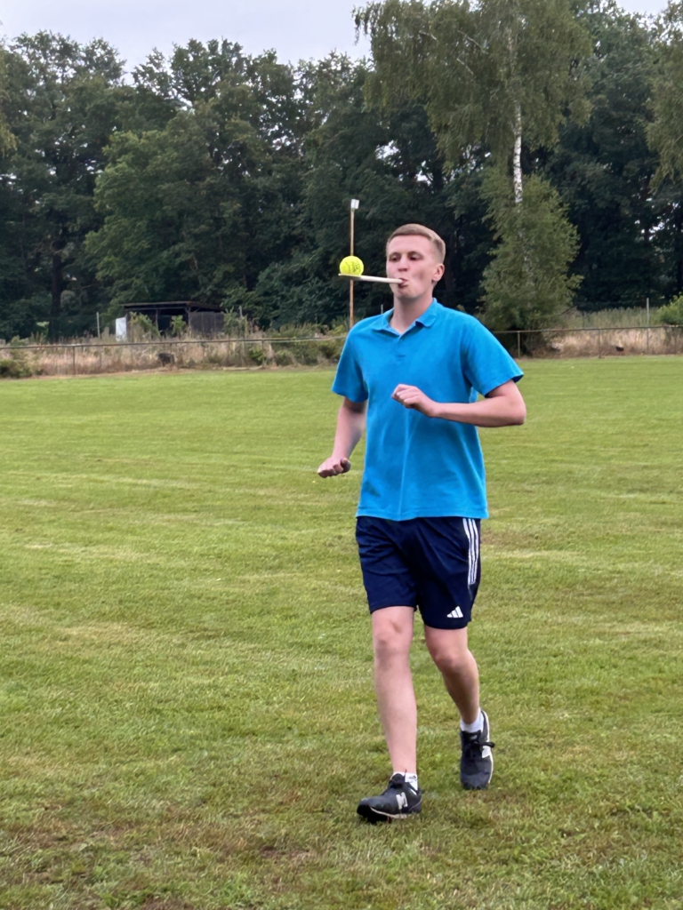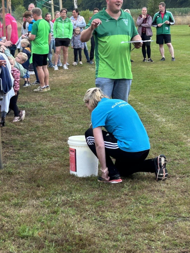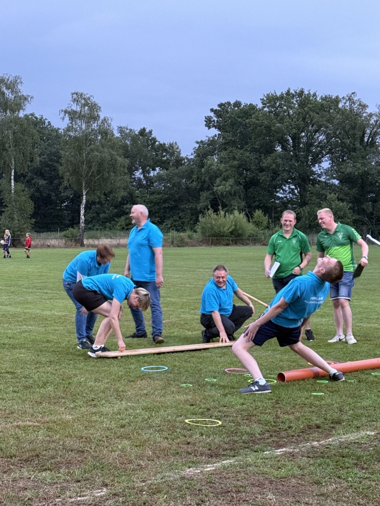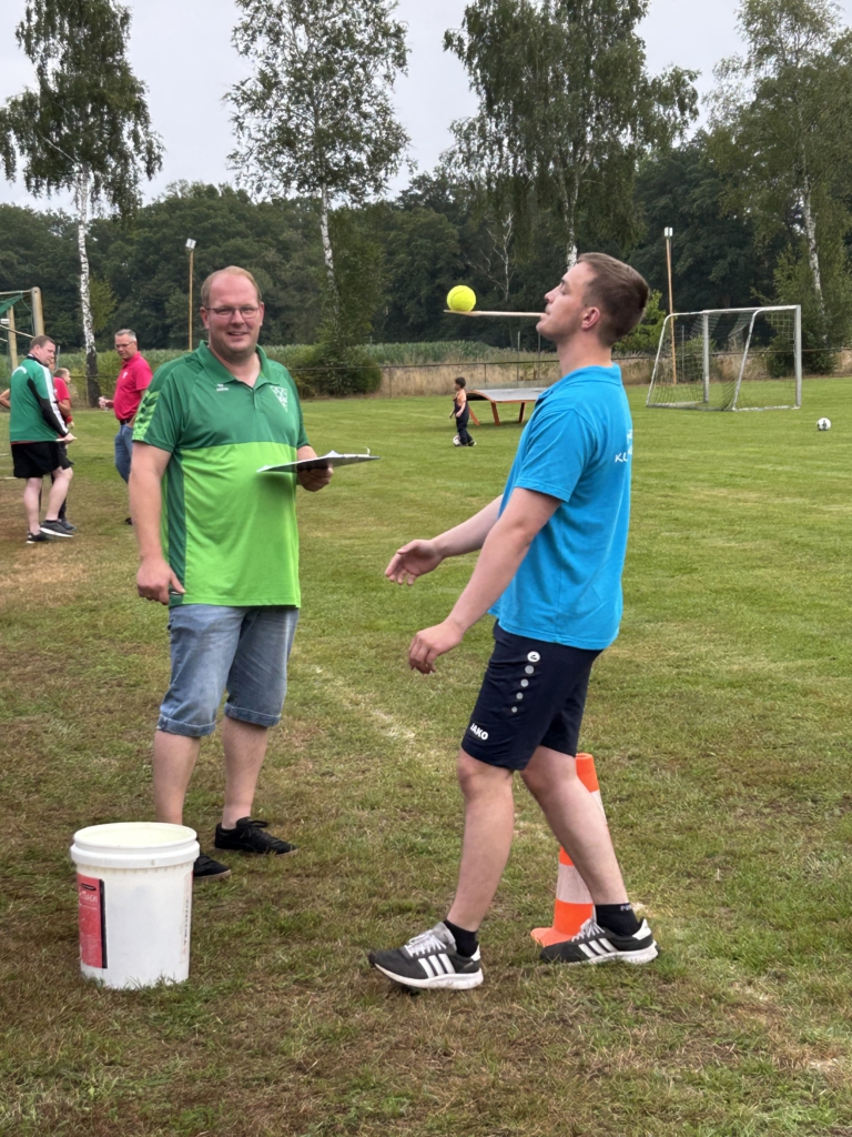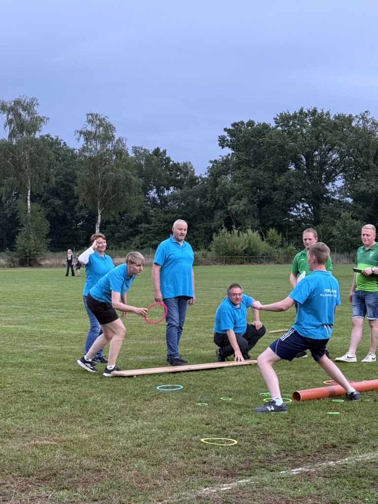 Beim ersten Teil der Dorfmeisterschaften 2025 hat sich das Orga-Team um die Familien Siemann, Sander und Reckweg wieder lustige, originelle und nervenaufreibende Spiele einfallen lassen. Es gab sechs Spiele zu bewältigen. Egal, ob es darum ging, die Bügelverschlüsse auf Bierflaschen zu schnipsen, sich mit einem Partner Rücken an Rücken mit Frischhaltefolie eingewickelt und einen Tennisball mit Schläger hochhaltend fortzubewegen, Tennisbälle mit einem Handtuch in ein kleines Fußballtor zu schleudern, als Menschenschlange von 10 Leuten durch einen Hula-Hoop-Reifen zu klettern, ein Fahrrad samt Cruiser rückwärts (!) durch einen Parkour zu manövrieren oder Wasser aus einer an den Schultern hängenden Gießkanne in einen Eimer zu befördern, es wurden immer mal wieder Nerven strapaziert und zugleich wurde auch herzlich gelacht.