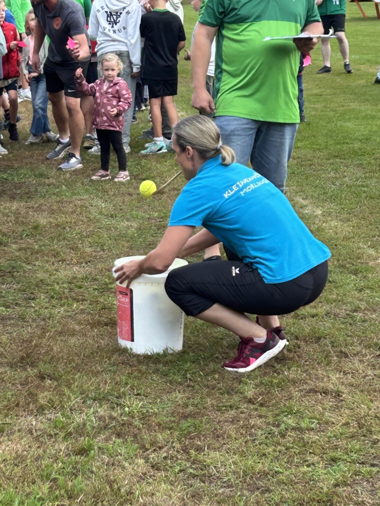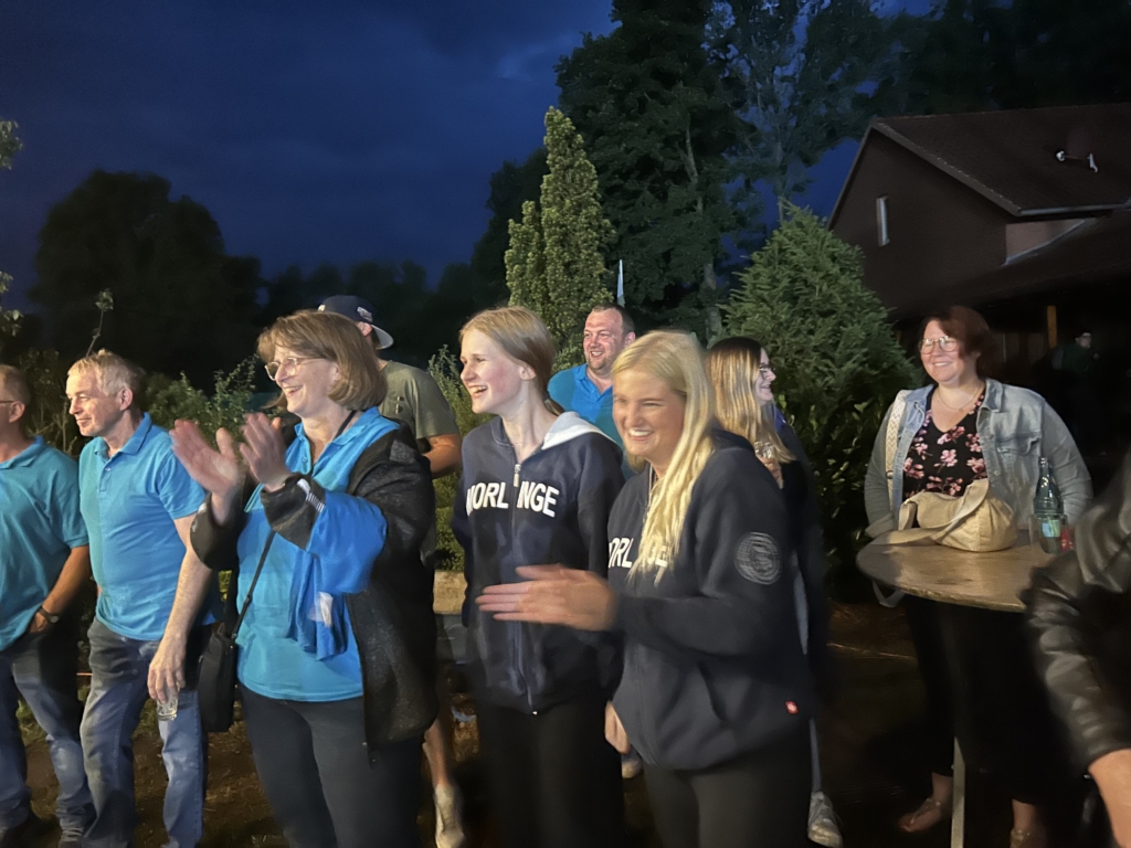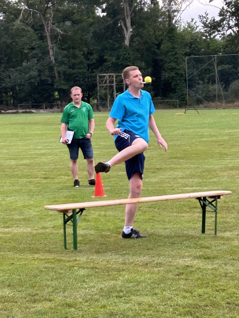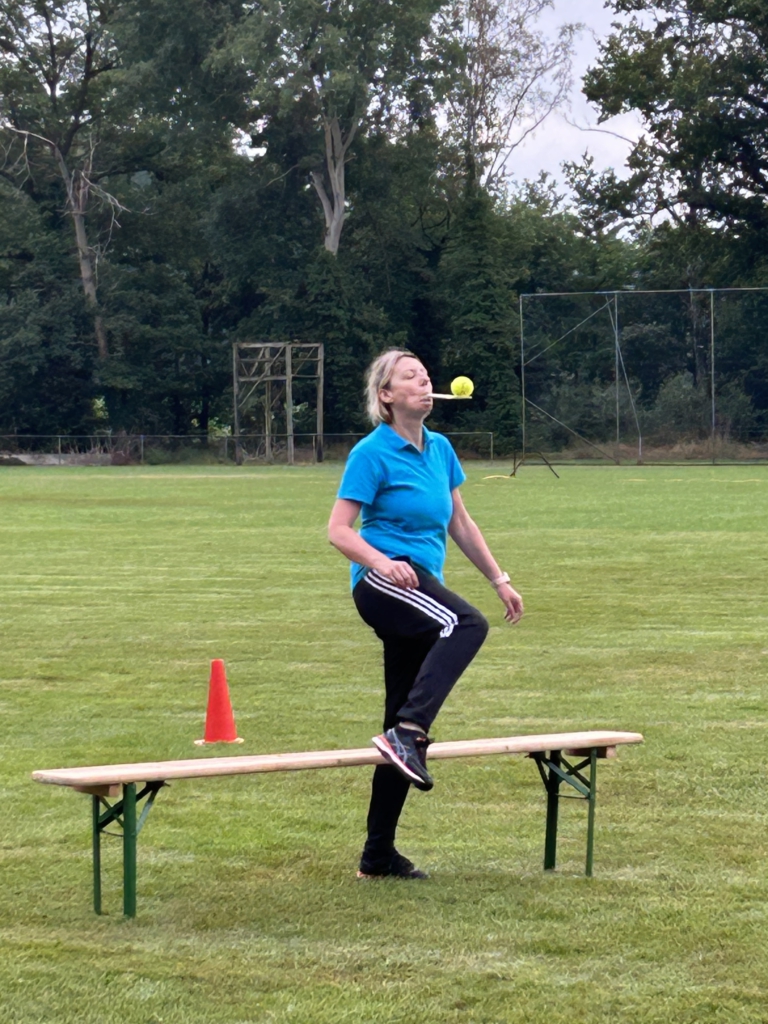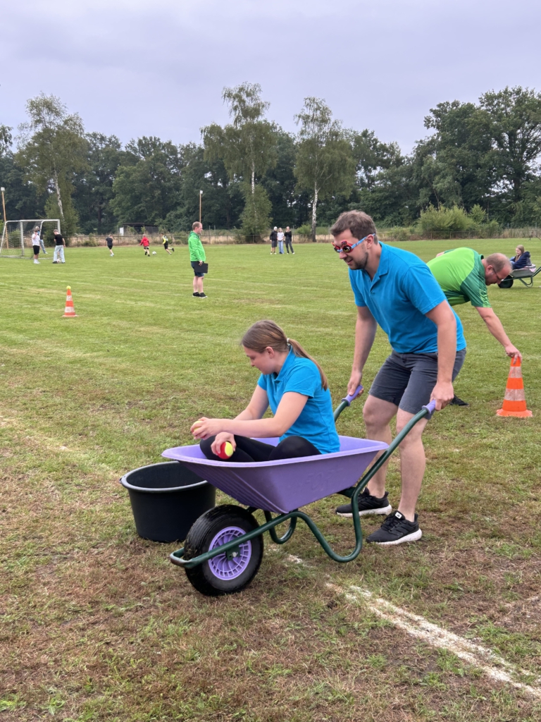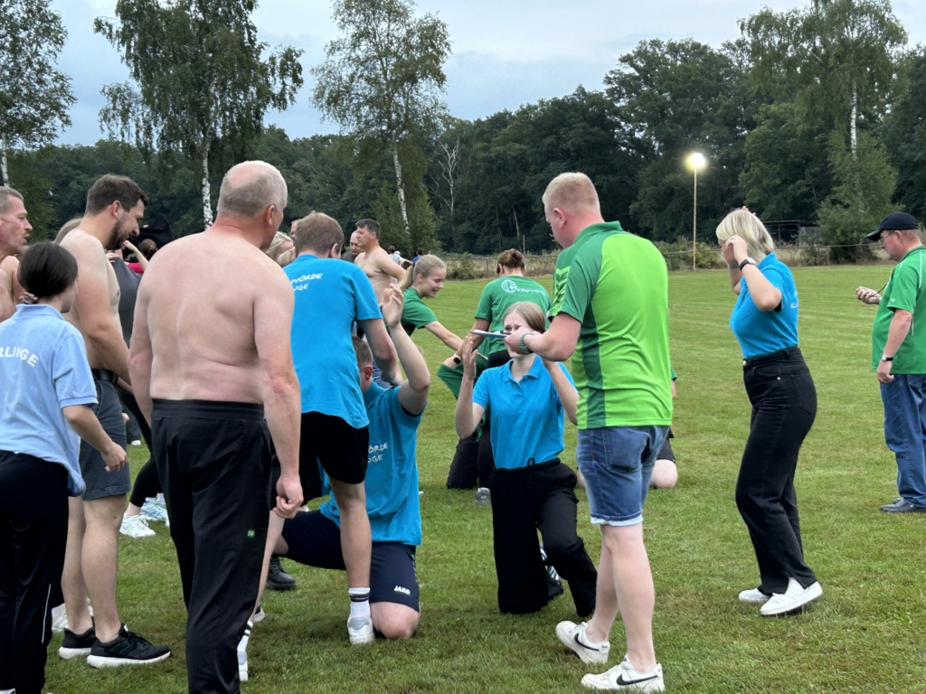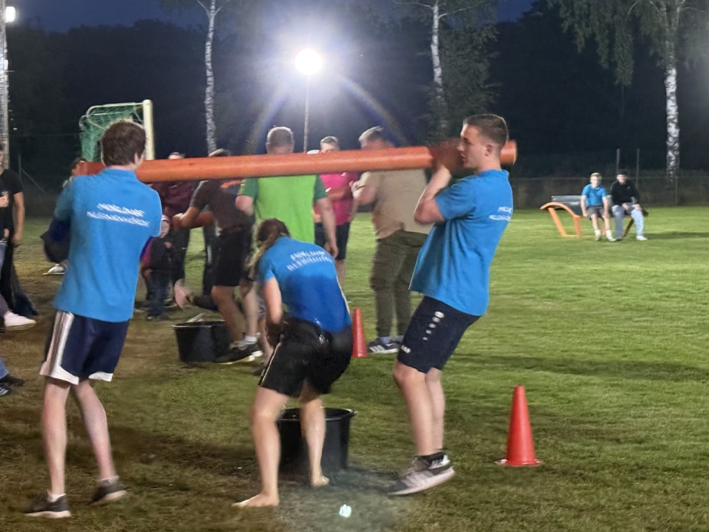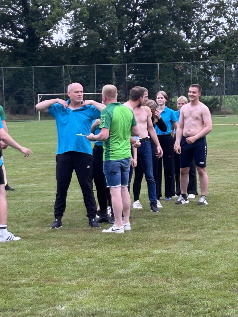 Beim ersten Teil der Dorfmeisterschaften 2025 hat sich das Orga-Team um die Familien Siemann, Sander und Reckweg wieder lustige, originelle und nervenaufreibende Spiele einfallen lassen. Es gab sechs Spiele zu bewältigen. Egal, ob es darum ging, die Bügelverschlüsse auf Bierflaschen zu schnipsen, sich mit einem Partner Rücken an Rücken mit Frischhaltefolie eingewickelt und einen Tennisball mit Schläger hochhaltend fortzubewegen, Tennisbälle mit einem Handtuch in ein kleines Fußballtor zu schleudern, als Menschenschlange von 10 Leuten durch einen Hula-Hoop-Reifen zu klettern, ein Fahrrad samt Cruiser rückwärts (!) durch einen Parkour zu manövrieren oder Wasser aus einer an den Schultern hängenden Gießkanne in einen Eimer zu befördern, es wurden immer mal wieder Nerven strapaziert und zugleich wurde auch herzlich gelacht.
