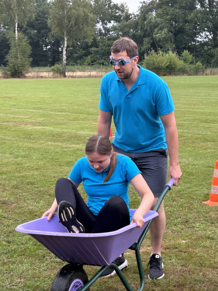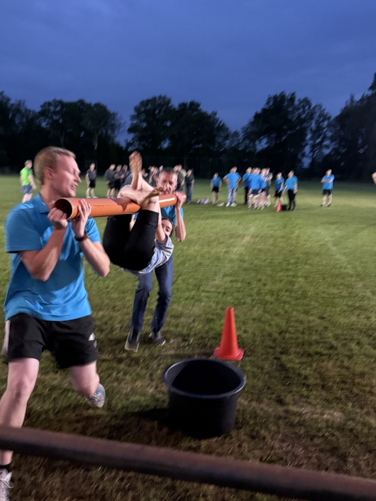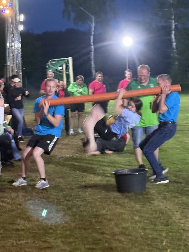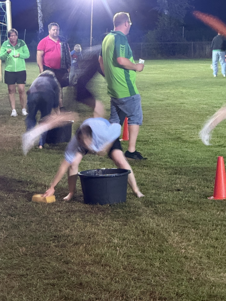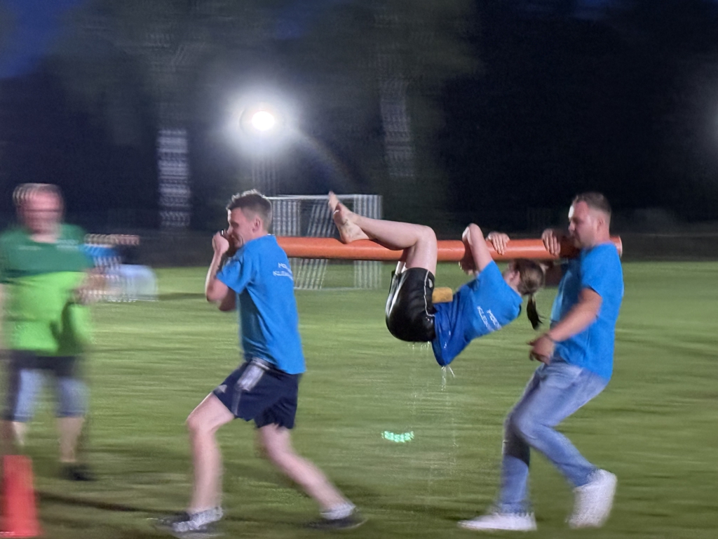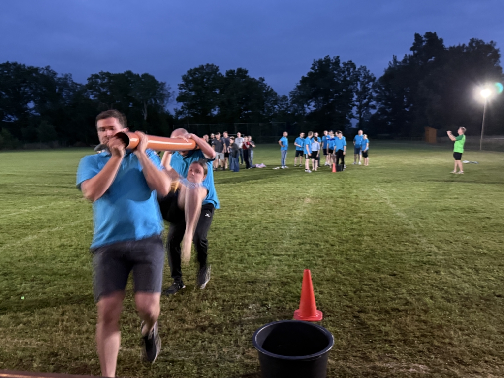 Im sechsten Spiel wurde es dann nochmal nass! Zwei Männer mussten ein KG-Rohr tragen, an dem eine Frau wie ein Faultier hing und auf dem Bauch einen nassen Schwamm transportierte. Hinten am Bottich wurde der Schwamm ausgequetscht und im Zurücklaufen machte sich das nächste Dreierteam bereit. In zehn Minuten Spielzeit wurde viel Wasser transportiert und viel Schweiß produziert.